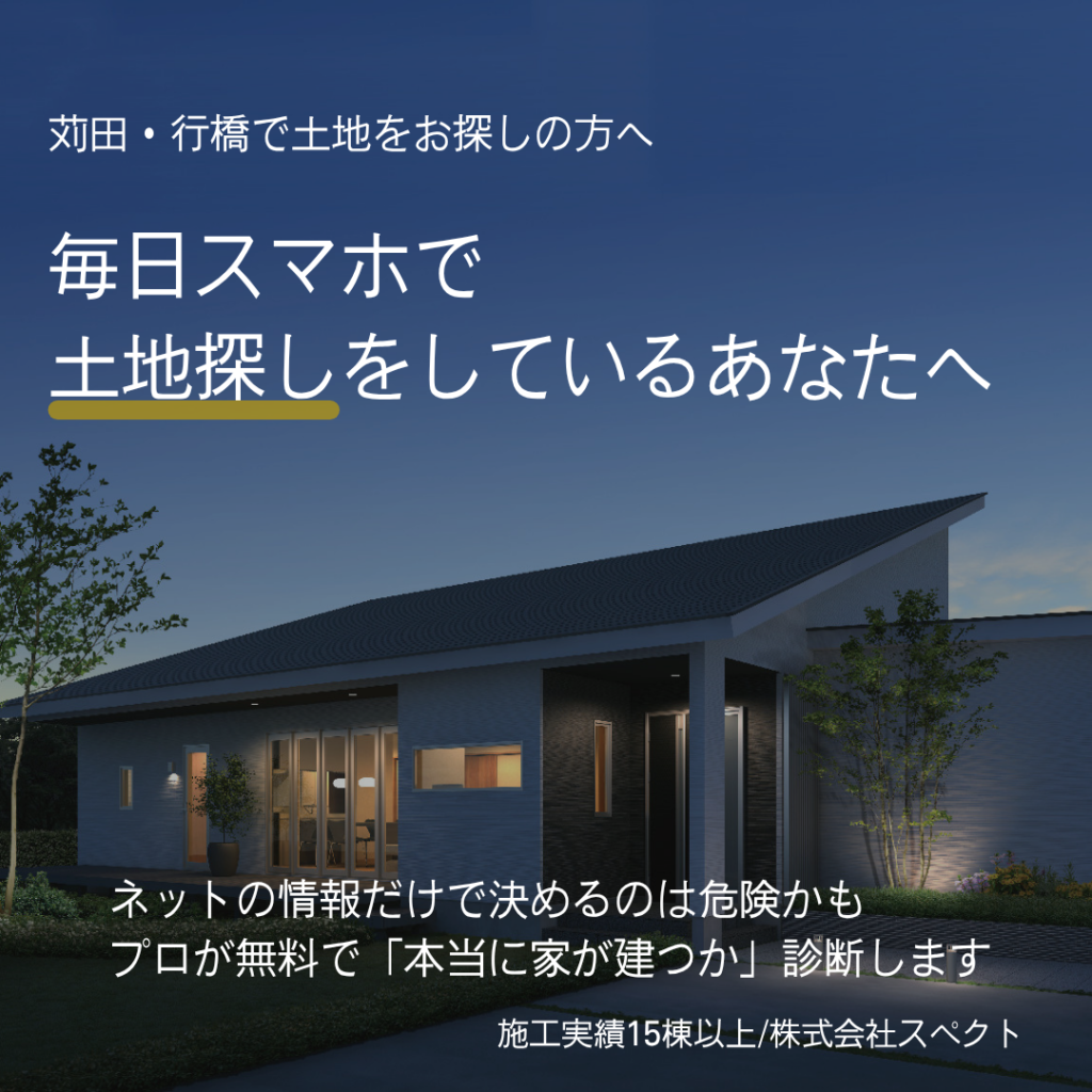 株式会社スペクトでは、苅田・行橋エリアで土地をお探しの方に向けて、工務店のプロ目線で行う**「失敗しない『土地×家づくり』無料シミュレーション」**を実施しています。